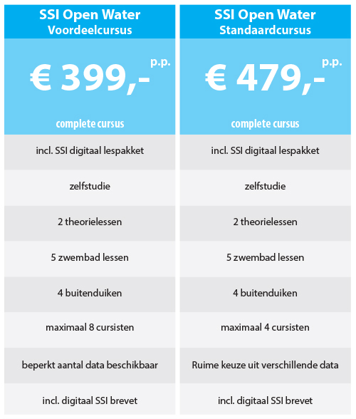 Wij bieden de Open Water cursus in verschillende varianten aan, met daarbij behorende voordelen. Mocht je in onderstaand schema toch niet de juiste match vinden voor je wensen, dan is er wellicht wel een maatwerk oplossing voor je te vinden. Hiervoor kun je uiteraard contact met ons opnemen.
